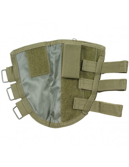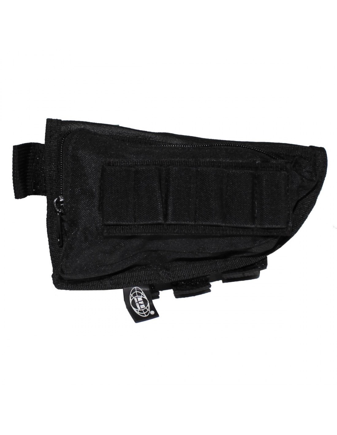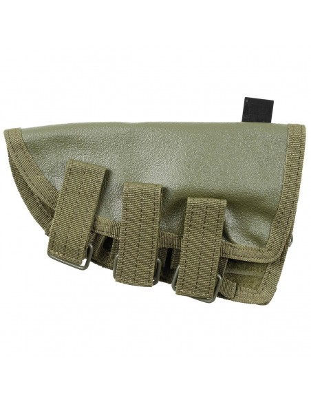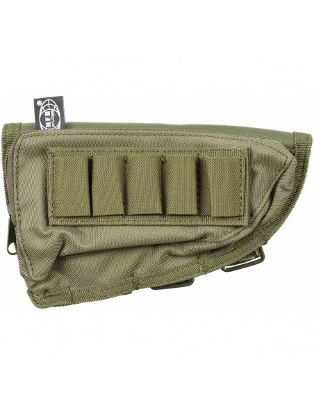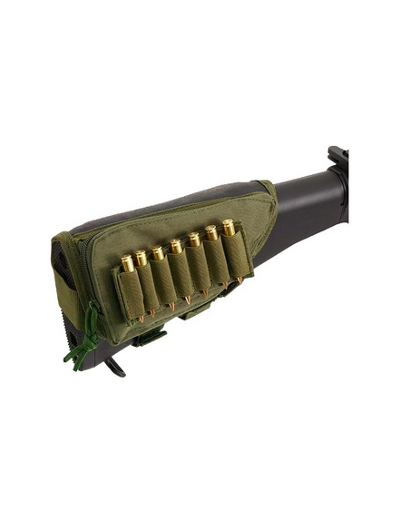 Cartouchière de crosse réglable par velcro pour fusil, avec sur la partie supérieur de la cartouchière une poche de stockage refermable par fermeture éclair.