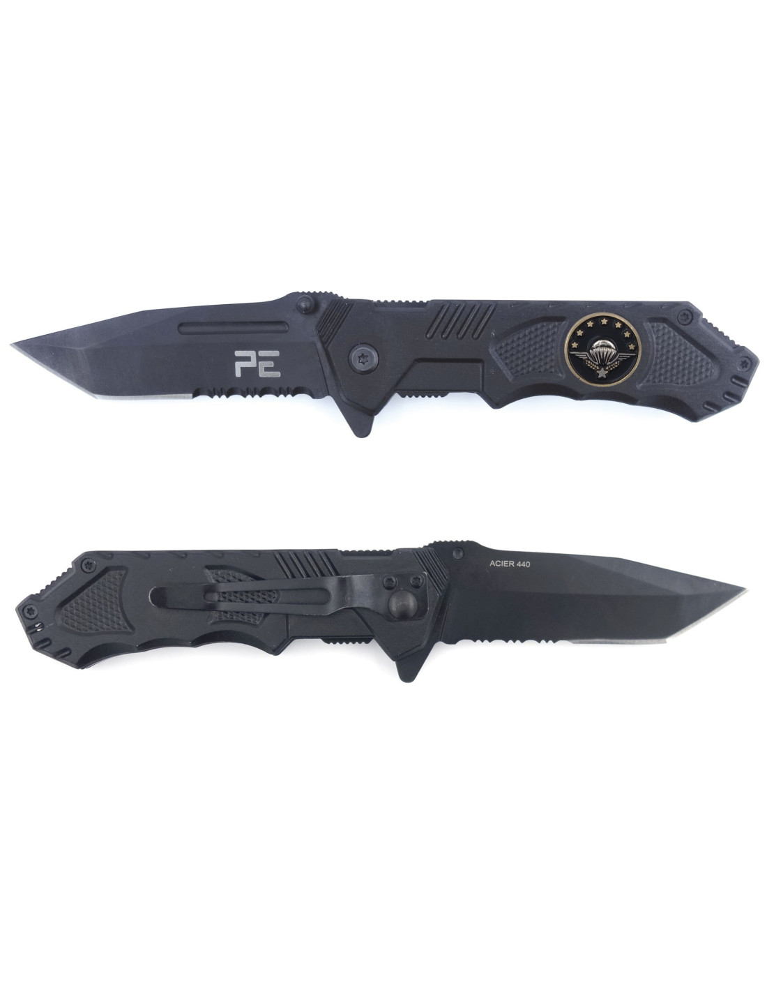 Système à ouverture rapide, lame en acier inoxydable 440 et livré avec un étui ceinture.