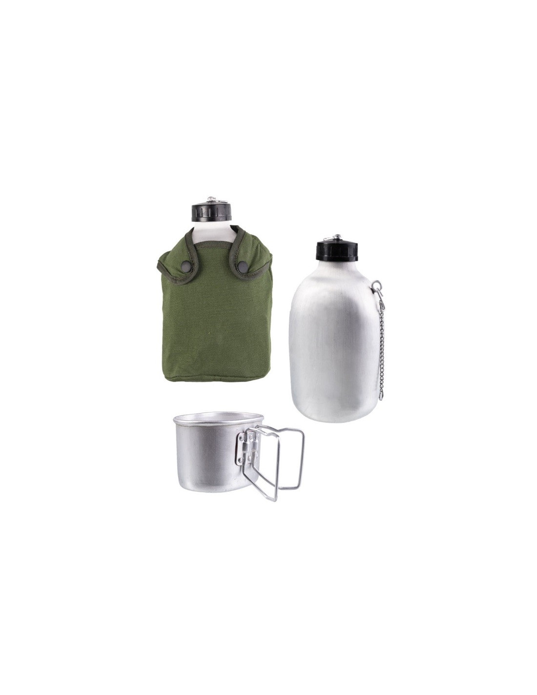 Gourde M1951 aluminium avec quart. Il s'agit d'une reproduction du célèbre modèle de gourde de l'armée française de la guerre d'Algérie (1954-1962).