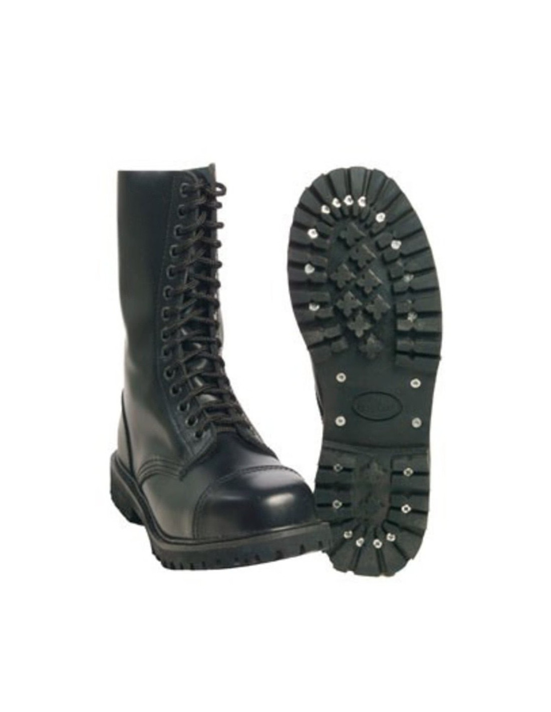 Les semelles en caoutchouc sont épaisses et directement vissées aux chaussures militaires afin de ne pas ressentir les aspérités du sol. La présence d'un bout coqué en acier au niveau de la pointe des pieds apporte un maximum de sécurité en cas de choc ou de chute.